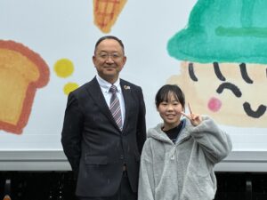 今回採用されたのは、松本市立寿小学校6年の泉柊花さんの作品です。食べ物をモチーフにした明るく親しみやすいデザインが車両全体に描かれ、印象的なラッピングトラックに仕上がりました。
