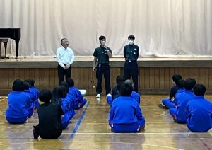当日は雨天であった為、体育館での交通安全教室となりましたが、動画やパネルを用いトラックの死角や内輪差、オーバーハングについてお伝えいたしました。また、車が時速40㎞で走行した場合の停止距離(車がブレーキをかけ停止するまでに必要な距離)をロープの長さで体験頂き、想像を超える距離に皆さん驚いていた様です。