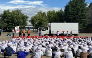 翌日の栗ガ丘小学校では、低学年300名、高学年300名の計600名が参加しました。ここでも実際の車両を前にした臨場感のある講話が行われ、「夕暮れが早い季節は明るい服を着てほしい」といった呼びかけに児童の皆さんも真剣に耳を傾けていました。